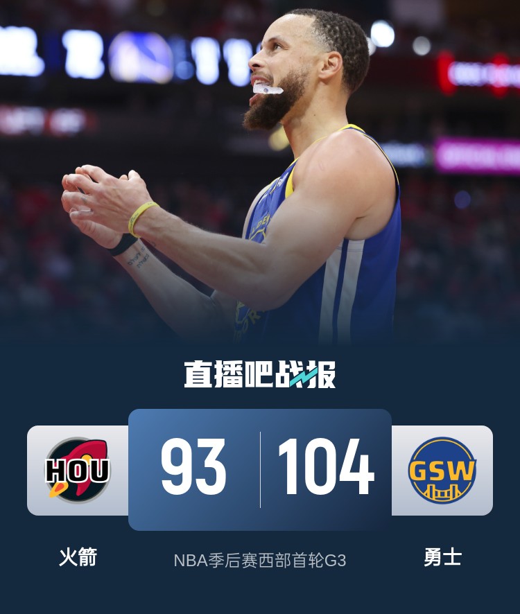 比赛上来,范弗里特就率先进入状态拿到球队开场前九分,不过勇士也是紧咬比分在首节后半段完成反超,但在最后两分半的时间里他们一分未得,次节火箭再次发力,一波攻势将分差拉开到两位数,好在之后库里站出来连续止血,勇士也对亚当斯进行砍人战术,半场结束时火箭的优势仅剩3分;下半场回来,火箭先拿五分稳住局势,但勇士的反扑势头还是打了起了,他们终于抓住机会完成反超,双方一直将悬念打到了最后,关键时刻小佩顿三分暴扣连续取分帮助勇士打出一波8-0的小高潮,狄龙则是犯满离场,最终勇士力克火箭,大比分2-1再次领先。