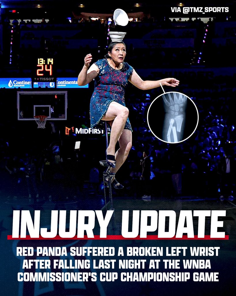 07月03日讯 昨日WNBA总裁杯,狂热击败山猫夺冠,顶碗大妈Red Panda在中场表演进行不到一分钟便从独轮车上摔下来,最终坐上轮椅离开。