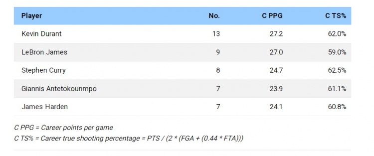 3.在至少得到20,000分的52名球员中,杜兰特的真实命中率(62%)仅次于斯蒂芬-库里。他也是这些球员中唯一一个投篮命中率至少50%且三分命中率至少37%的球员。