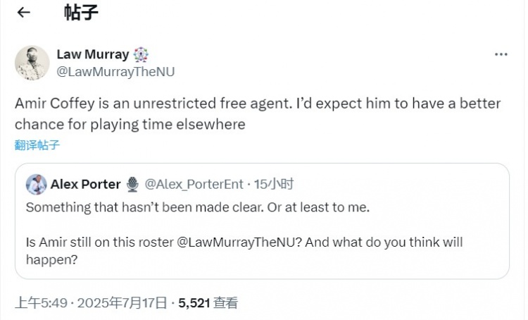 Law Murray在个人推特上写道:“科菲目前是完全自由球员。我预计他在其他地方会有更多的上场机会。”