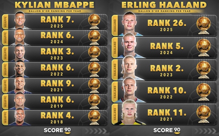 姆巴佩/哈兰德历年金球奖排名对比: