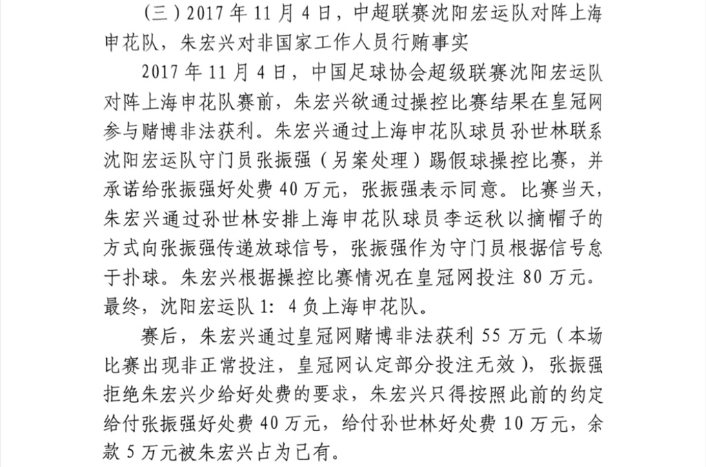今日网传秦升的一审判决书,谈到了2017年申花4-1战胜沈阳宏运的比赛,沈阳门将张振强收40万好处费踢假球,孙世林通过申花队友李运秋以摘帽子为信号。