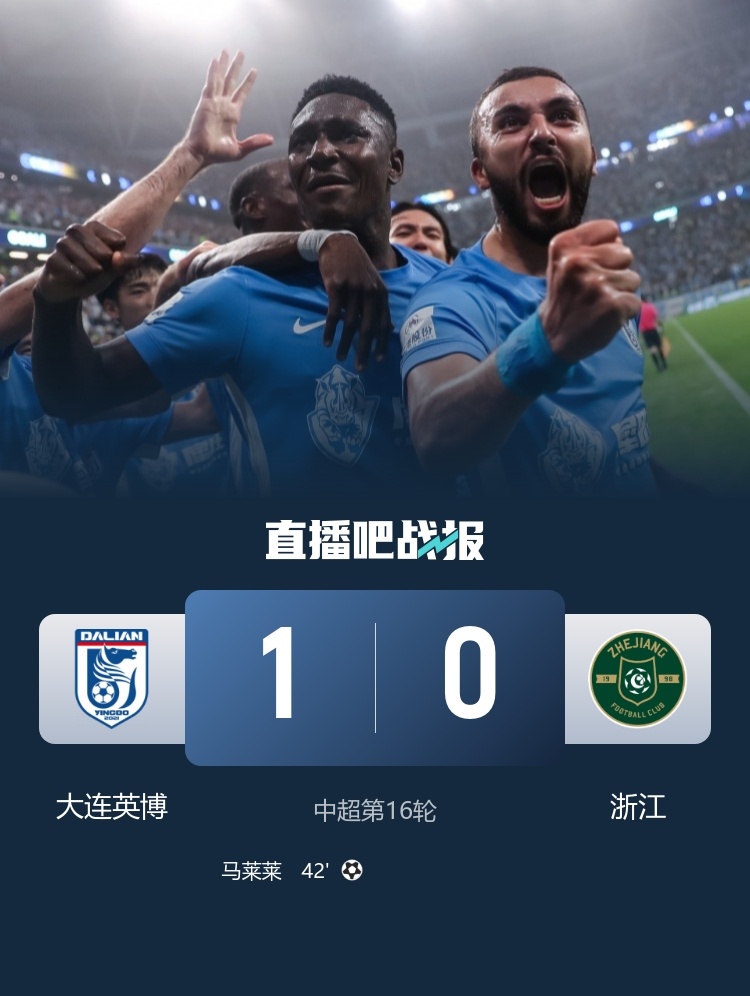 6月30日讯 北京时间6月30日19:35,中超第16轮,大连英博在主场大连梭鱼湾足球场迎战浙江队。上半场,大连英博多次威胁到赵博把守的球门,拉布亚德助攻马莱莱头球破门,卢卡斯补时破门被吹越位;下半场,王钰栋替补登场,双方均未破门。最终,大连英博1-0战胜浙江队,浙江队和英博同积20分,分列第9和第10位。