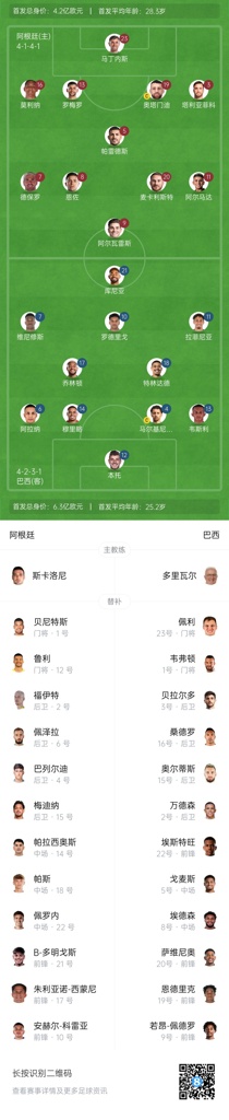 阿根廷替补:1-贝尼特斯、12-鲁利、2-福伊特、6-佩泽拉、4-巴列尔迪、15-梅迪纳、14-帕拉西奥斯、18-帕斯、22-佩罗内、21-B-多明戈斯、17-朱利亚诺-西蒙尼、10-安赫尔-科雷亚