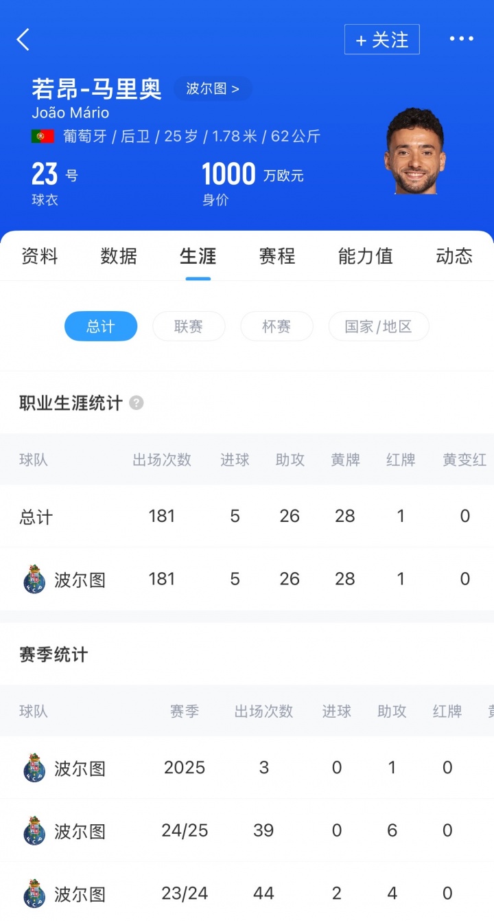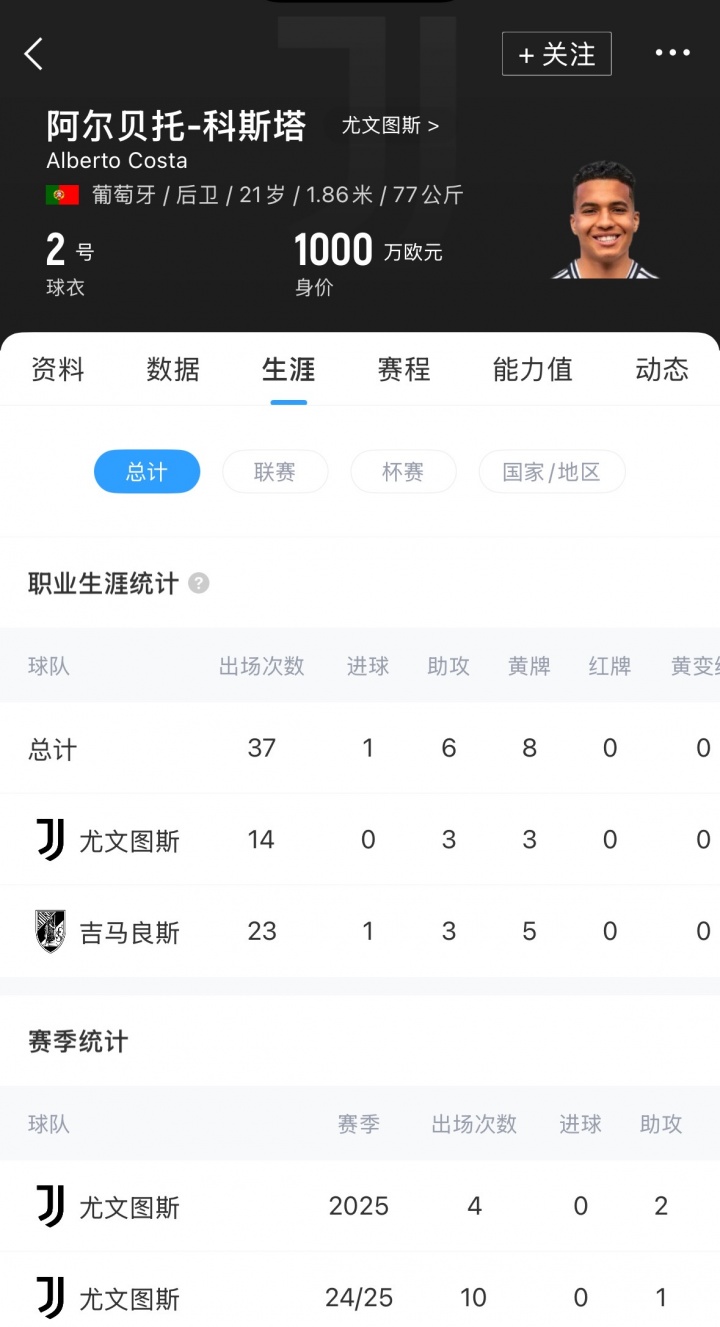 阿尔贝托-科斯塔现年21岁,尤文在今年1月以1380万欧元转会费签下,目前球员身价1000万欧元。若昂-马里奥现年25岁,身价也为1000万欧元。