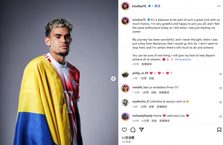 7月31日讯 拜仁已经官宣从利物浦签下哥伦比亚边锋迪亚斯,后者也通过社媒晒出签约照并发文纪念: