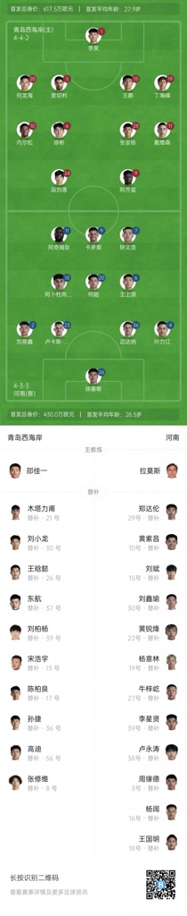 青岛西海岸首发:1-李昊、5-里切利(F)、6-徐彬、15-王鹏、19-丁海峰、28-张呈栋、20-何龙海、24-段刘愚、9-阿齐兹(F)、10-内尔松卢斯(F)、11-戴维森(F)