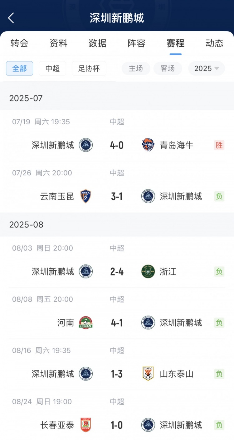 8月24日讯 在中超联赛第22轮中,深圳新鹏城客场0-1负于保级对手长春亚泰,这不仅是新鹏城的5连败,也将他们进一步推向保级区边缘。
